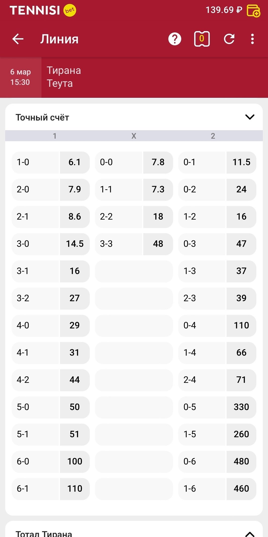 Tennisi и Winline удобно делят ставки по столбикам: слева будут все ТС на победу хозяев, посередине — на ничью, а справа — на победу гостей. «Балтбет» пошёл ещё дальше и сделал специальные кнопки для фильтрации счёта по командам. В «Олимпе» всё в строчку, но порядок «хозяева — ничья — гости» тоже соблюдается. А вот в «Лиге Ставок» и БЕТСИТИ найти нужный рынок будет тяжелее, они своеобразно распределяют варианты.