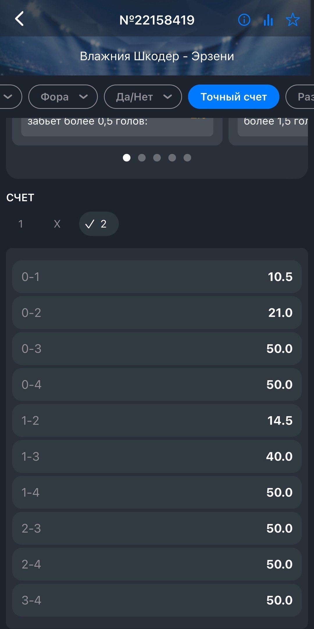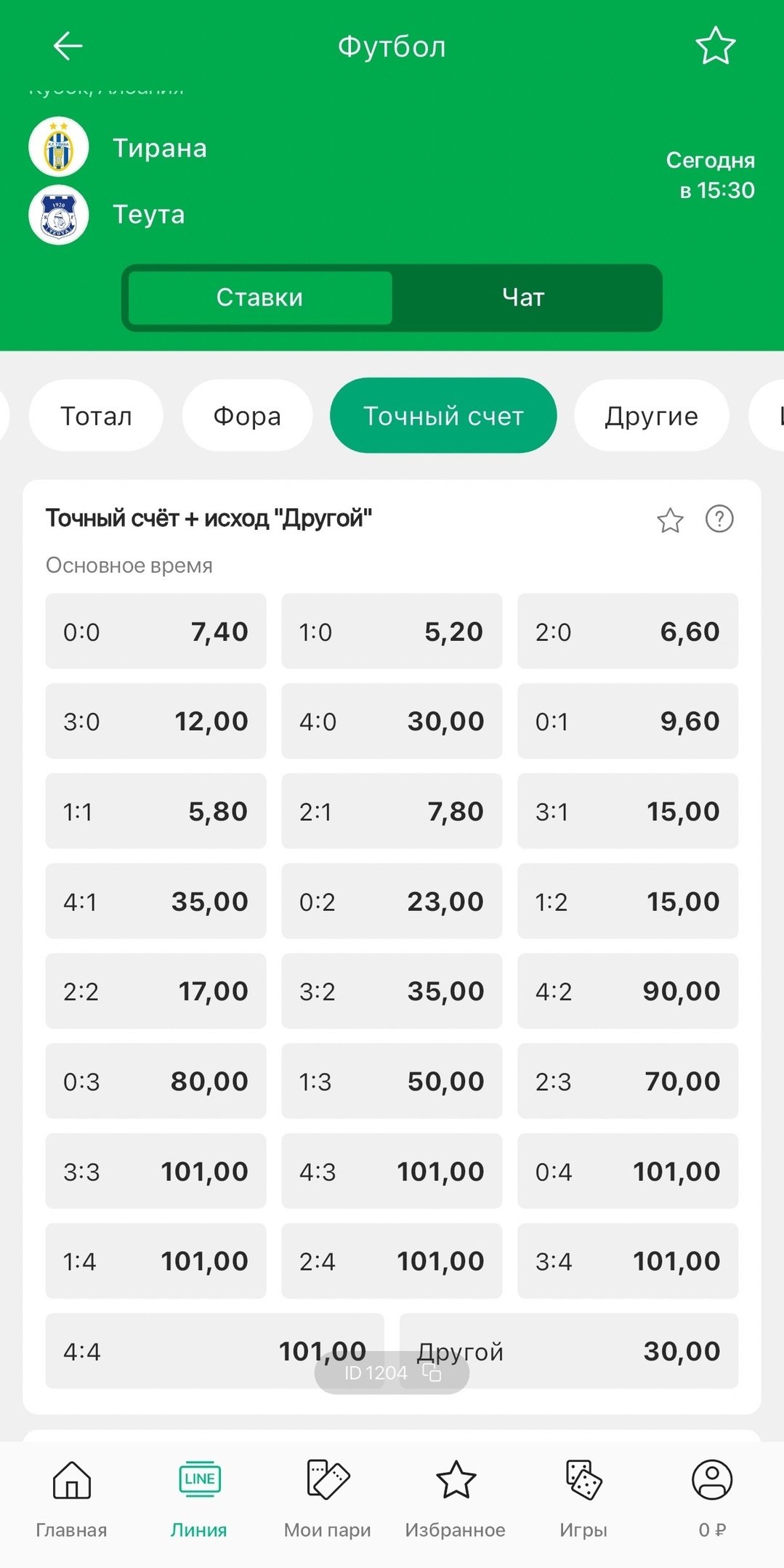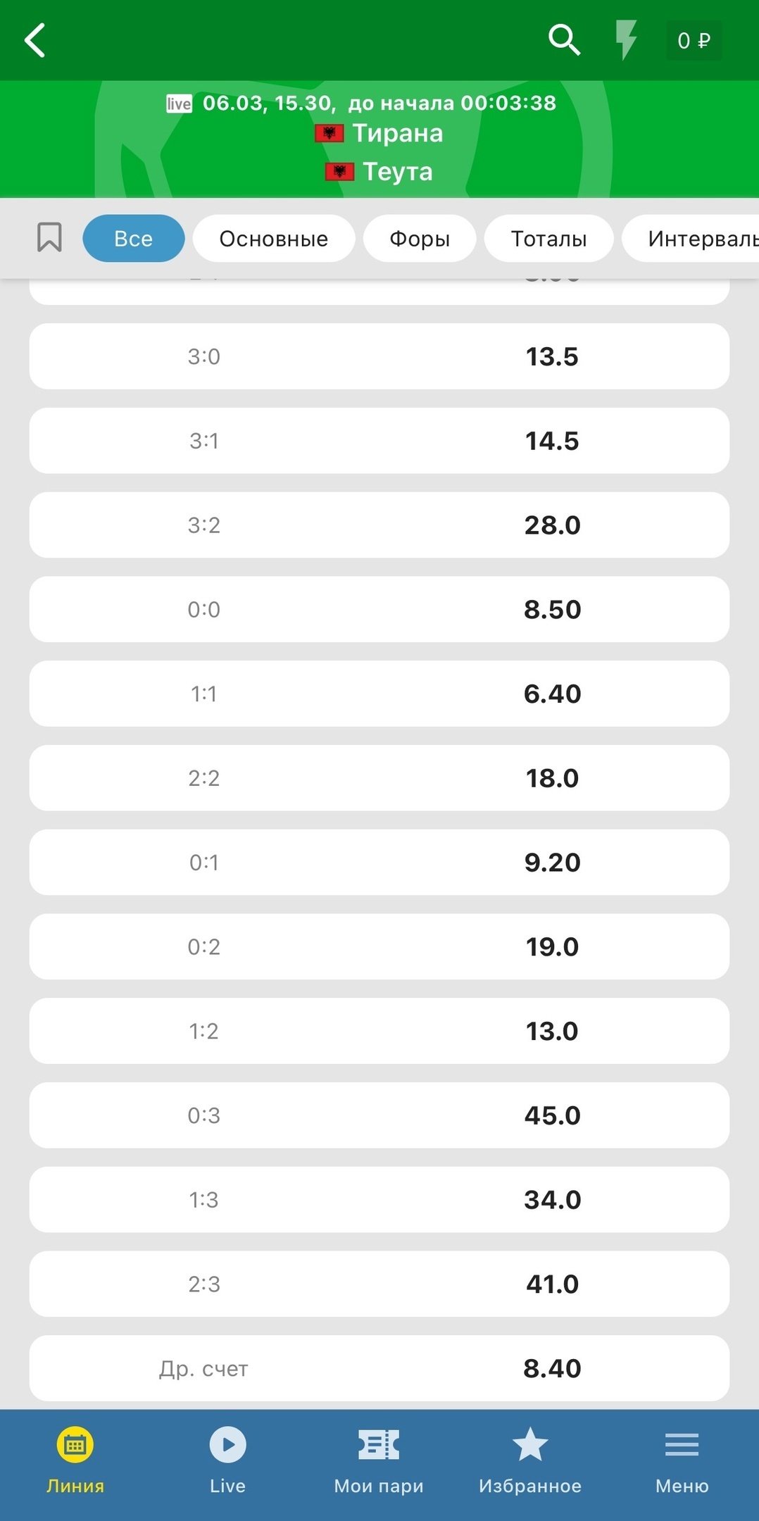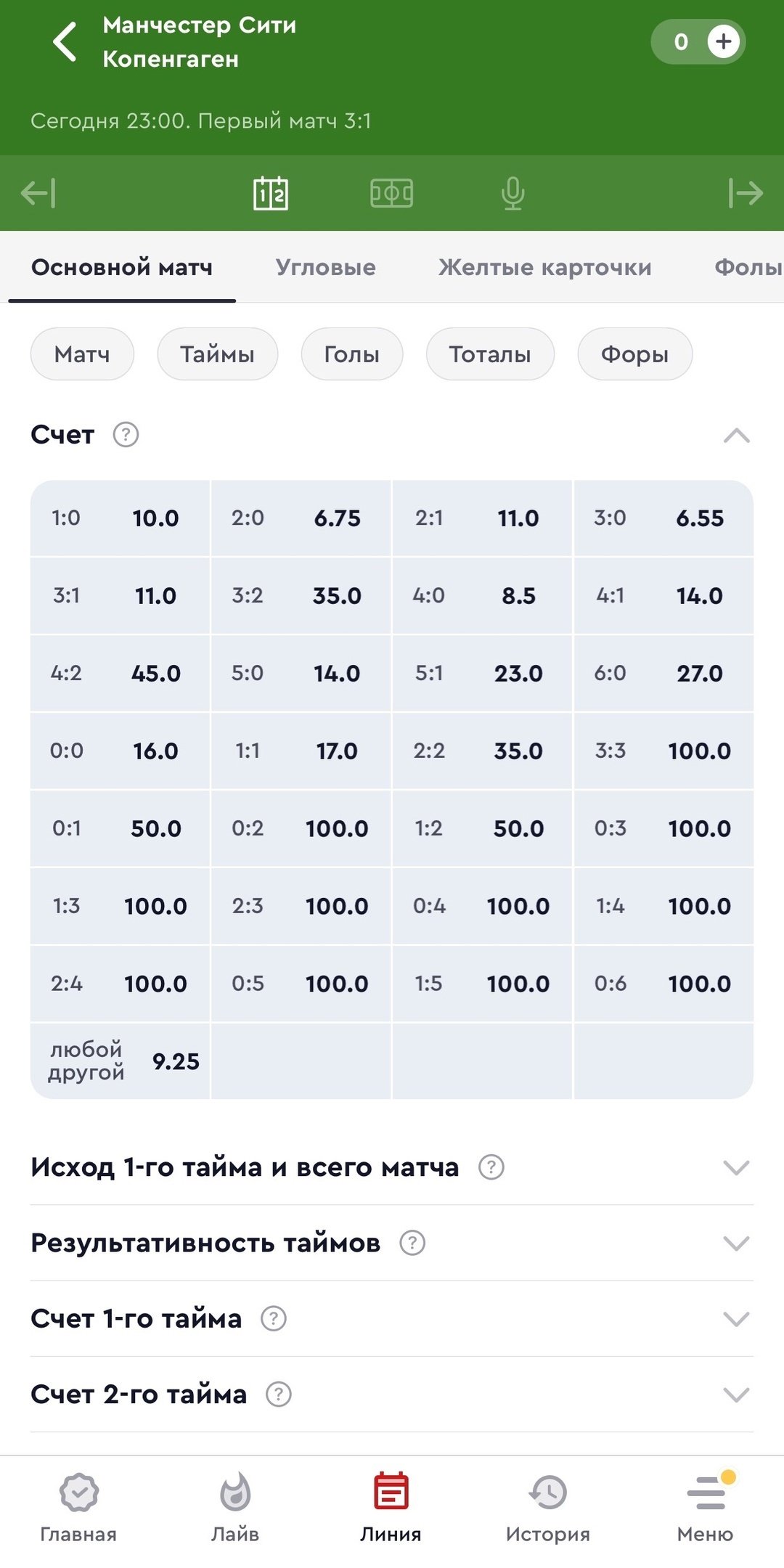 Только в BetBoom у ставок на счёт есть свой раздел горизонтального меню, в остальных БК клиенту придётся немного полистать вниз. Но точные счета входят в список основных рынков, поэтому обычно находятся в разделах «Матч» или «Голы».