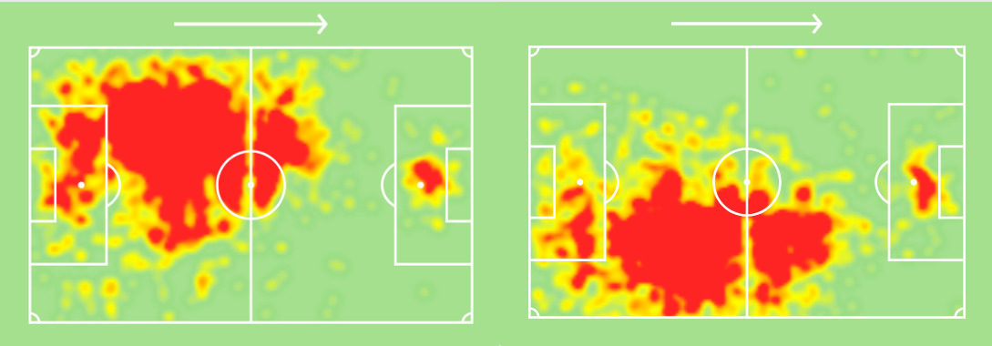 Доминирование по-клопповски обычно даёт сочетание высокого владения и захвата территории. Лучшее подтверждение этих слов — тепловые схемы Ван Дейка и Матипа. Замечаете, насколько много времени защитники проводят выше центра поля?