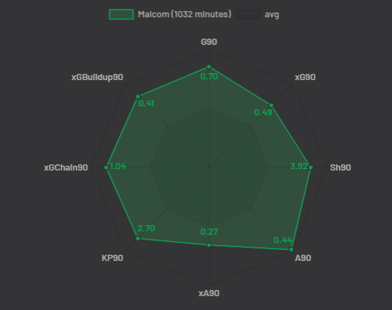 «Зенит» чаще атакует через правый фланг, а Малком поучаствовал в более 80% голов сезона (а их, на секундочку, 33 только в РПЛ). Бразилец делает всё (безо всяких «почти»), а его статистика в Understat вообще на космическом уровне. Страдают только ожидаемые передачи, но, камон, какие передачи от человека, который борется за звание лучшего бомбардира…
