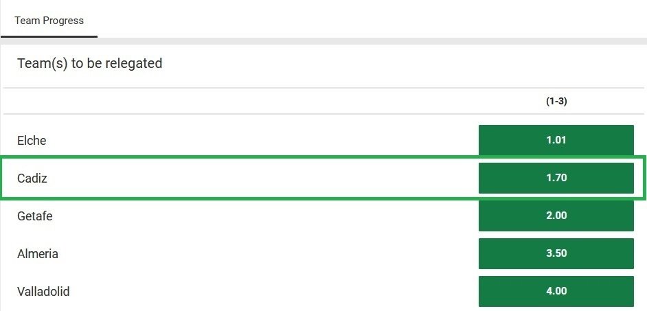 Пусть коэффициент на вылет «Кадиса» и не самый низкий, но показательна пропасть между котировками на 3 главных претендентов и остальные клубы: на понижение «Альмерии», например, дают аж 3.50.