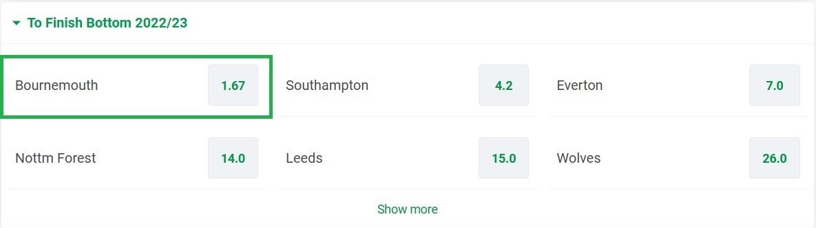 «Вишни» занимают предпоследнее место в турнирной таблице, опережая «Саутгемптон» на 2 очка, но британская букмекерская контора Paddy Power уверена, что именно «Борнмут» — главный претендент на последнее место по итогам чемпионата. На 20-е место клуба дают всего 1.70, а на «святых», для сравнения, аж 4.20.