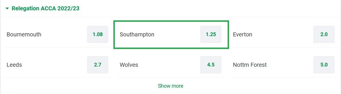 Британские букмекеры менее оптимистичны в оценках: на вылет «Сотона» из «вышки» в текущем сезоне дают всего 1.25. По мнению западных аналитиков, борьба развернётся лишь за 18-ю строчку турнирной таблицы, в то время как последние 2 места уже забронированы.