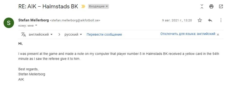 Хорошая попытка, товарищ судья. Но больше мы на такое не поведёмся, ищем дополнительное подтверждение карточки. В продолжение поисков мы направили запросы в шведскую лигу, а также в пресс-службы игравших команд. И в итоге получили ответ от пресс-офицера АИК. В котором он сообщил, что лично присутствовал на матче и собственными глазами видел эту карточку.