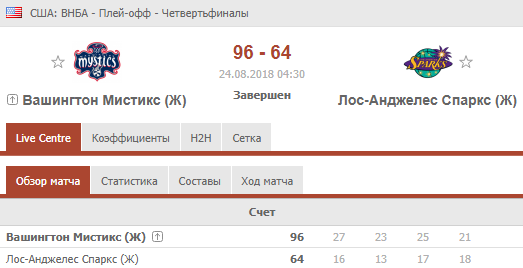 Игра стартует 24 августа в 1:30 ночи. Победитель этой пары отправится в полуфинал где сыграет против Сиэтлл Шторм который успели занять первое место в регулярном сезоне.