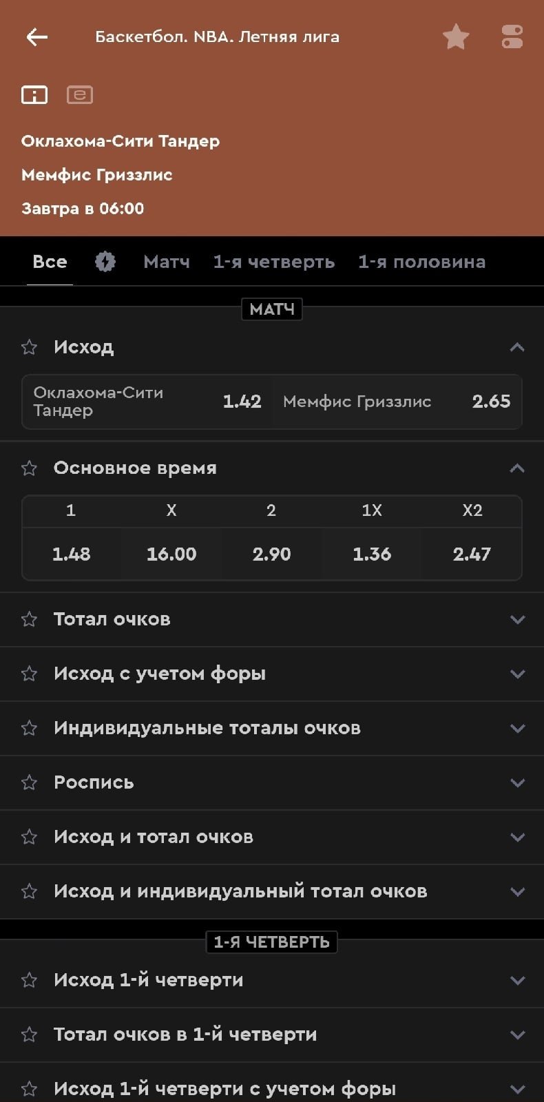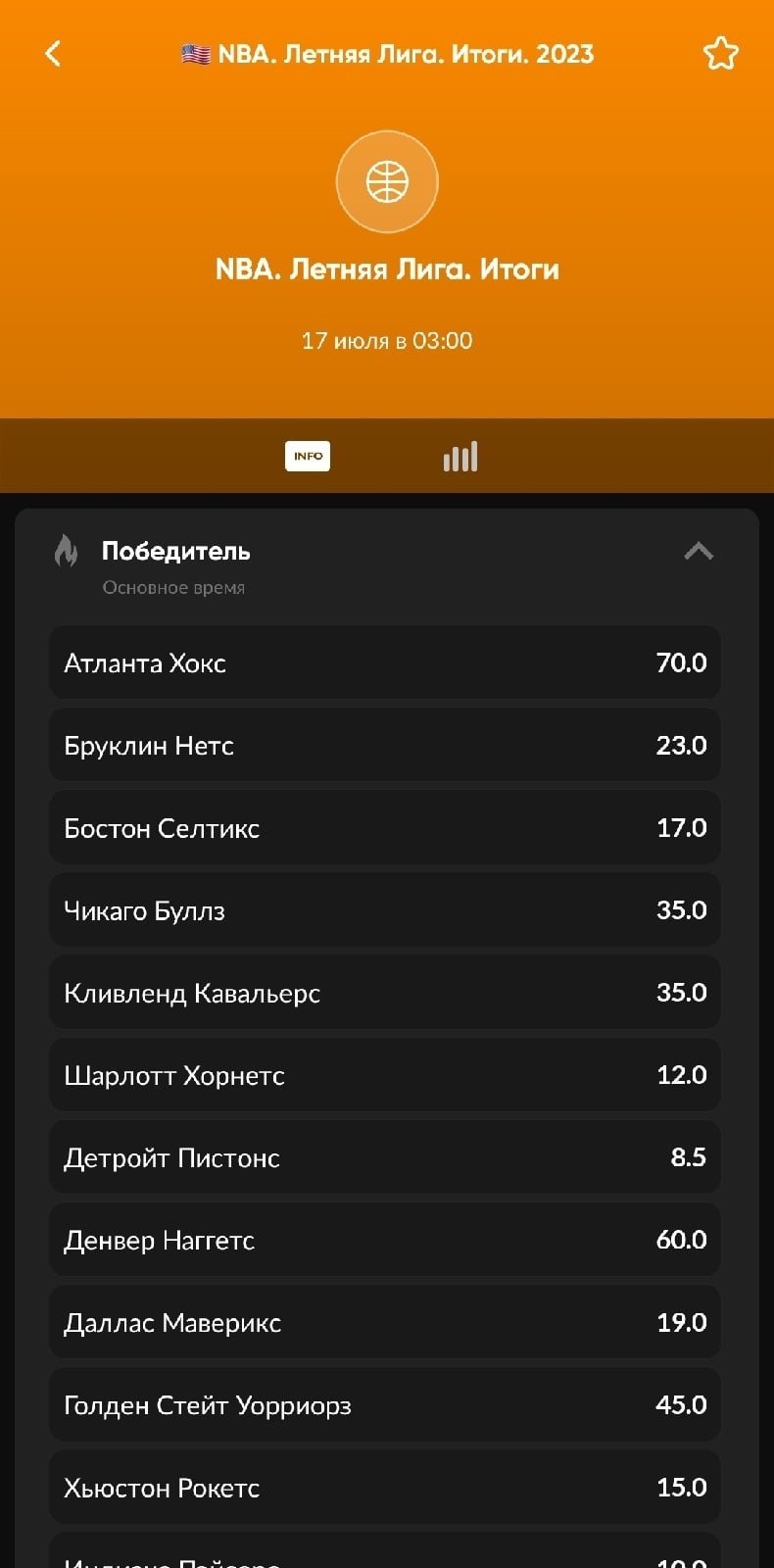 Зато в BetBoom и «Мелбет» перед стартом лиги был долгосрок — можно было поставить на победителя турнира. Фаворитом шла «Оклахома» за 5.50. К слову, главную лигу, проходящую в Лас-Вегасе, только дважды за последние 11 лет выиграла команда Восточной конференции НБА — «Чикаго» в 2016-м и «Кливленд» в 2023-м. За кэф 35.00 💪