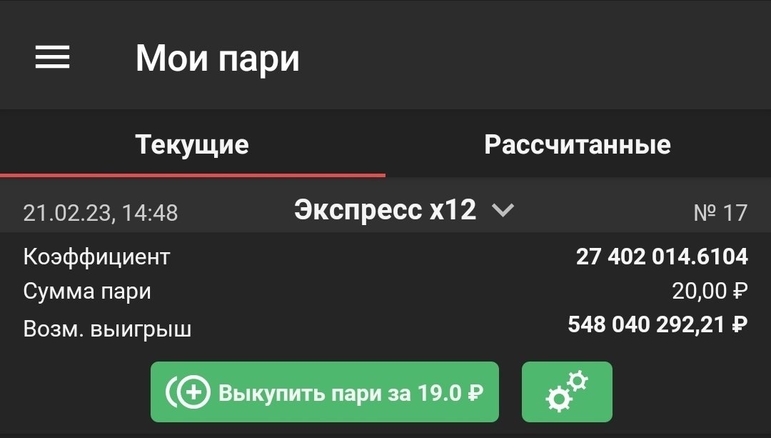 Всё тот же «Бетсити» принял у меня ставку в 20 рублей на кэф в 27 миллионов, а мой потенциальный выигрыш в 10 раз превышает максимум конторы. Понятно, что такой «паровоз» вряд ли когда-то доедет, но а что если?