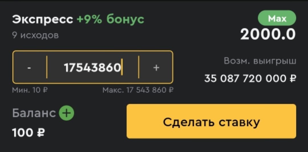 Интересная ситуация сложилась в «Олимпе»: букмекер не даёт собрать купон с кэфом больше 2000.00, зато готов принять на него свыше 17 лямов. И даже прописывает в купоне максимальный выигрыш: 35 миллиардов!