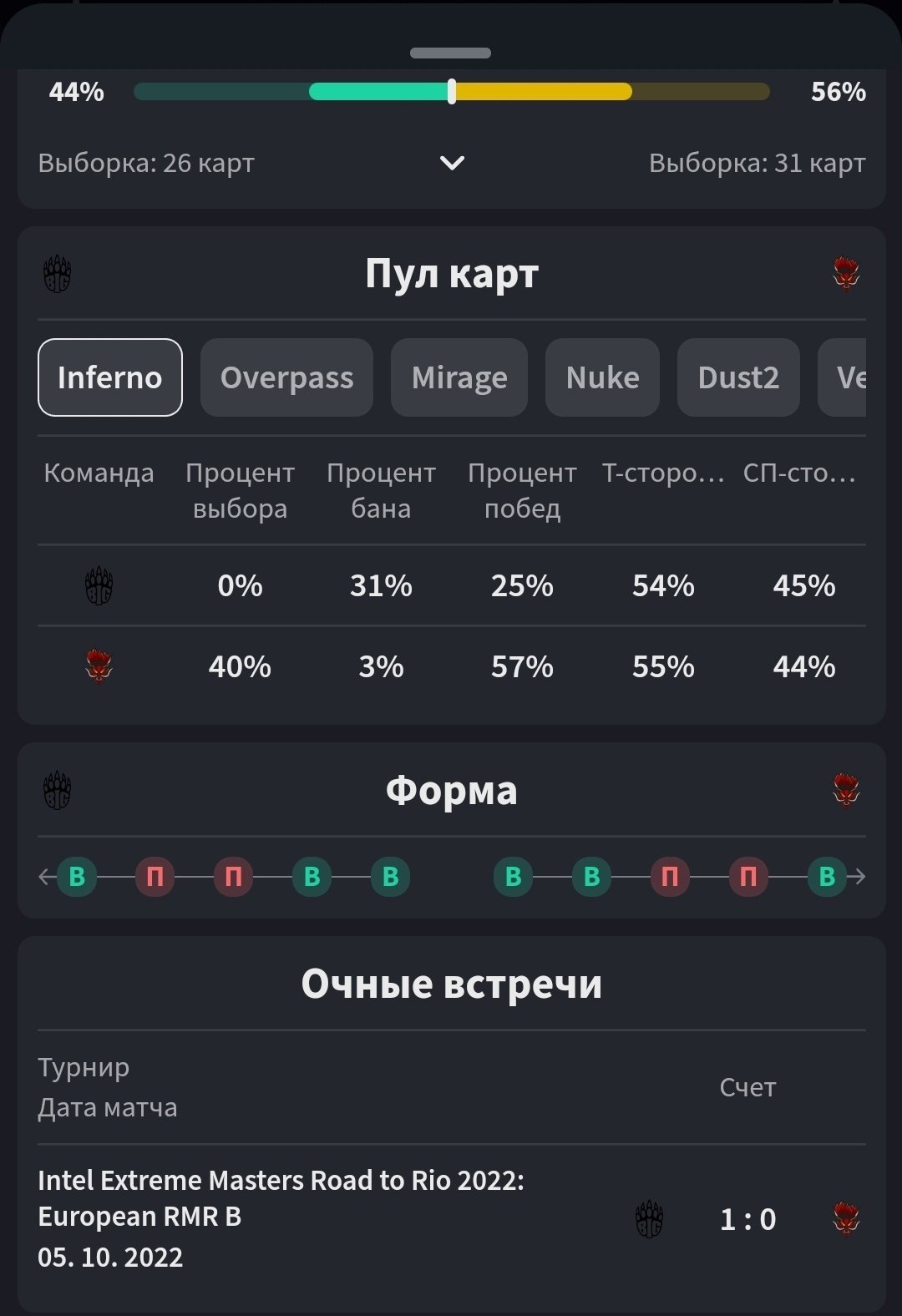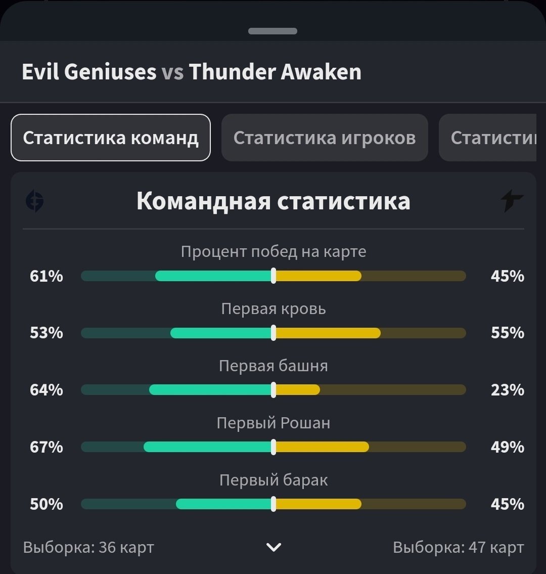 1. Командная. Здесь информация о форме команд, истории очных встреч, наиболее популярном пуле героев (Дота), результатах на конкретной карте (CS) и более глубокие цифры (процент побед по маркетам «первое убийство», «первая разрушенная башня», «первый Рошан», «пистолетный раунд» и т.д.).