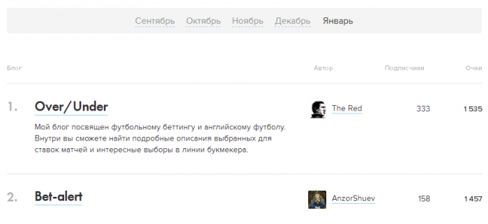 В момент наступления нового года декабрьский рейтинг обнулился. В январе лучшие места в нем должны занять те блоги, которые будут самым интересным образом рассказывать о самых интересных явлениях в мире ставок.