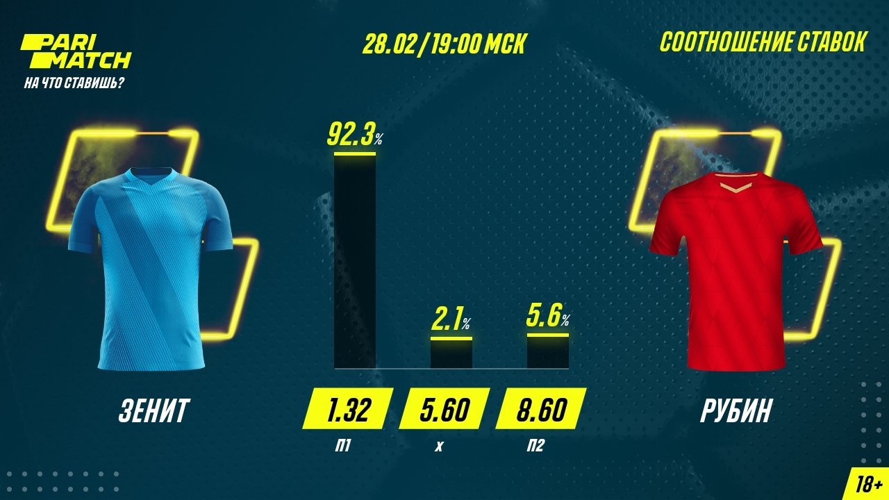 Матч 19-го тура РПЛ «Зенит» — «Рубин» начнётся в понедельник, 28 февраля, в 19:00 по московскому времени. В прямом эфире вы сможете посмотреть игру на телеканале «Матч ТВ» или на сайтах букмекерских контор Winline и Parimatch.