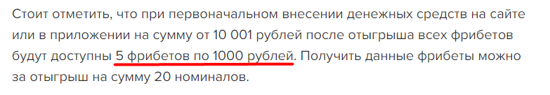 Стоит отметить, что при первоначальном внесении денежных средств на сайте или в приложении на сумму от 10 001 рублей после отыгрыша всех фрибетов будут доступны 5 фрибетов по 1000 рублей. Получить данные фрибеты можно за отыгрыш на сумму 20 номиналов.