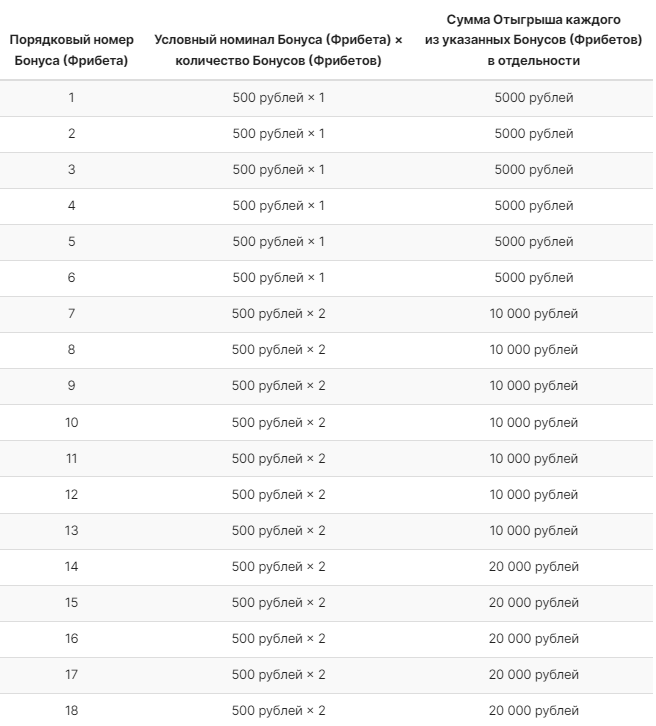 Чтобы получать первые несколько фрибетов номиналом 500 рублей, необходимо выполнить отыгрыш на сумму 5000 рублей для получения каждого бонуса. Для получения последующих фрибетов общей суммой 1000 рублей, необходимо отыгрывать уже по 10000 рублей.