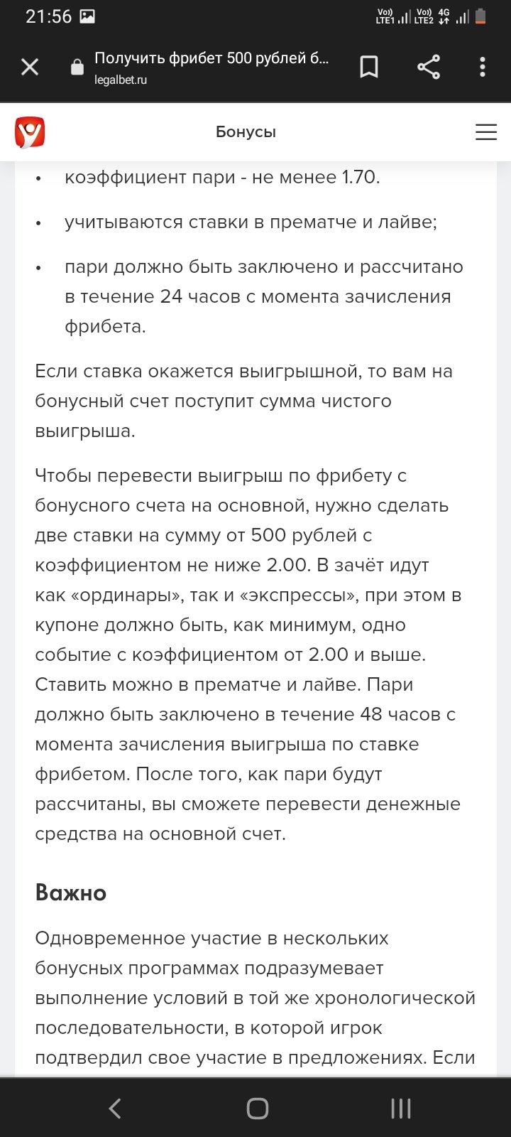 Чтобы перевести выигрыш по фрибету с бонусного счета на основной, нужно сделать две ставки на сумму от 500 рублей с коэффициентом не ниже 2.00. В зачёт идут как «ординары», так и «экспрессы», при этом в купоне должно быть, как минимум, одно событие с коэффициентом от 2.00 и выше.