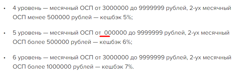 - 6 уровень — месячный ОСП от 3000000 до 9999999 рублей, 2-ух месячный ОСП более 1000000 рублей — кешбэк 7%.