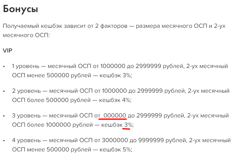 - 3 уровень — месячный ОСП от 1000000 до 2999999 рублей, 2-ух месячный ОСП более 1000000 рублей — кешбэк 5%;