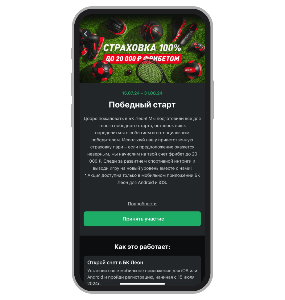 Сделайте аккаунт в приложении, пополните счёт, поставьте на экспресс или ординар с коэффициентом от 1.70. После расчёта первой ставки оператор начислит фрибет на сумму пари, но не больше 2000 рублей. | |