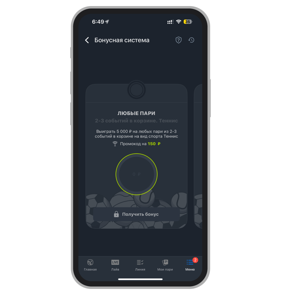 После пополнения счёта нужно отыграть сумму в десятикратном размере, делая ставки типа «ординар», «экспресс» или «система». После выполнения условий игрок получает фрибет на сумму, равную размеру первого депозита (но не более 25 000 рублей).