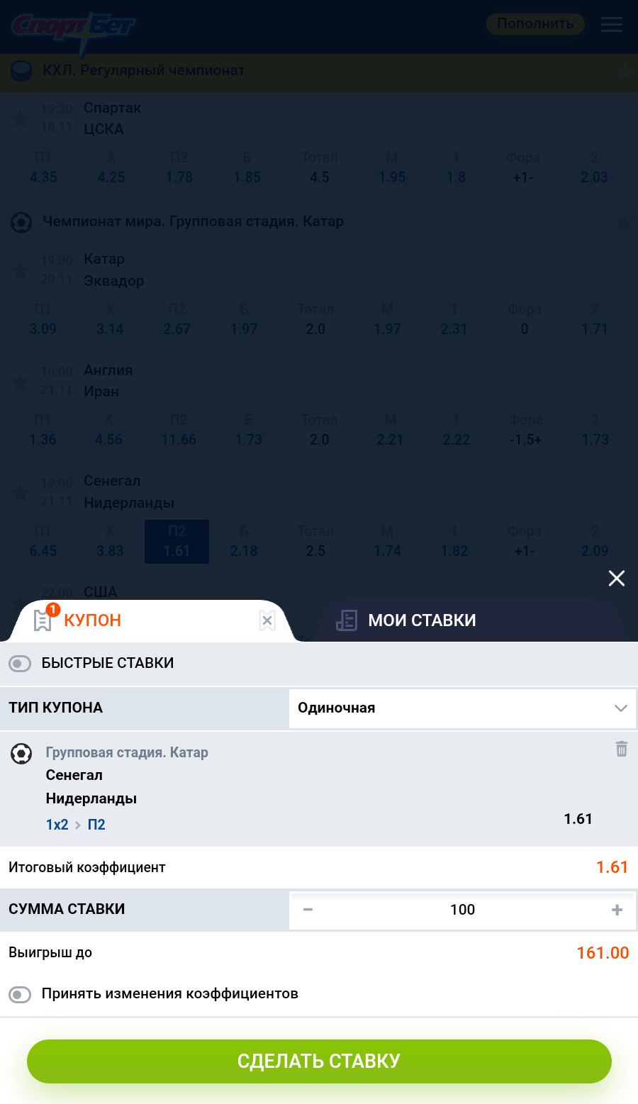 По условиям БК «Спортбет», фрибеты выдают только клиентам, хотя бы один раз пополнившим счёт. Внести депозит можно банковской карты, с кошельков ЦУПИС, ЮMoney и QIWI, а также с баланса телефона. Минимальная сумма пополнения — 100 рублей.