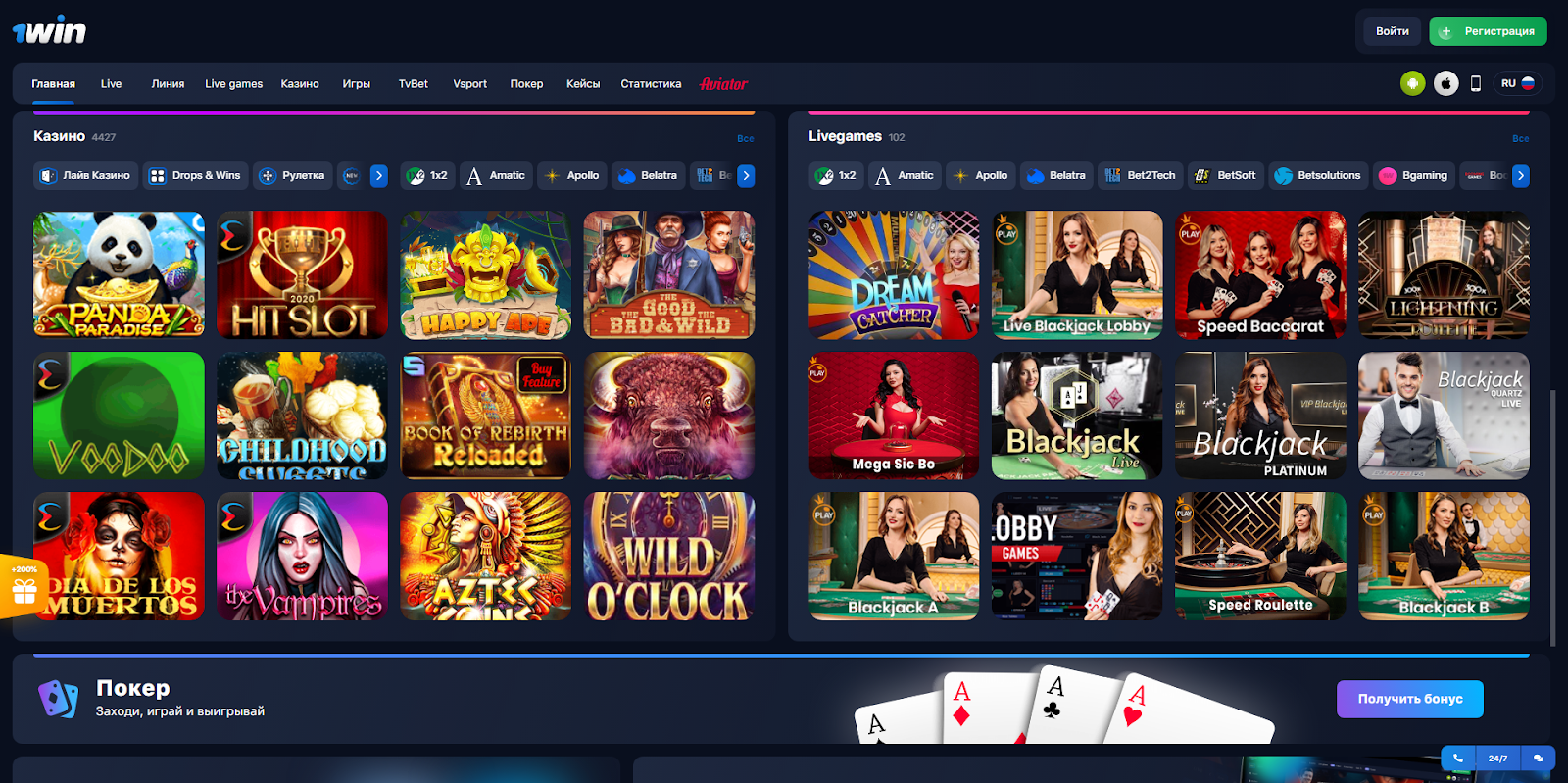 На главной странице «1вин» игроку предлагается сыграть в казино, покер или открыть линию для ставок. Весь функционал игорного онлайн-заведения будет доступен только после регистрации.