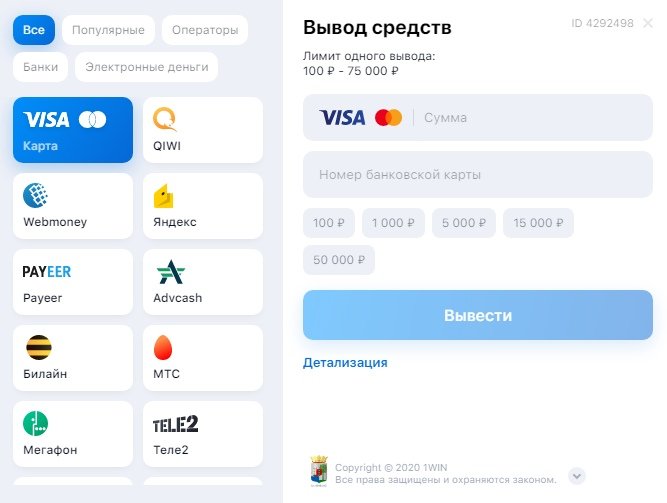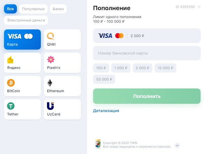 Букмекерская контора 1WIN предлагает пользователем следующие методы внесения депозита: