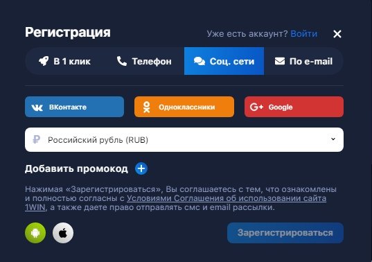 Через социальные сети. Войти на сайт оператора «1вин» можно с помощью аккаунтов «ВКонтакте», «Одноклассники», Google.