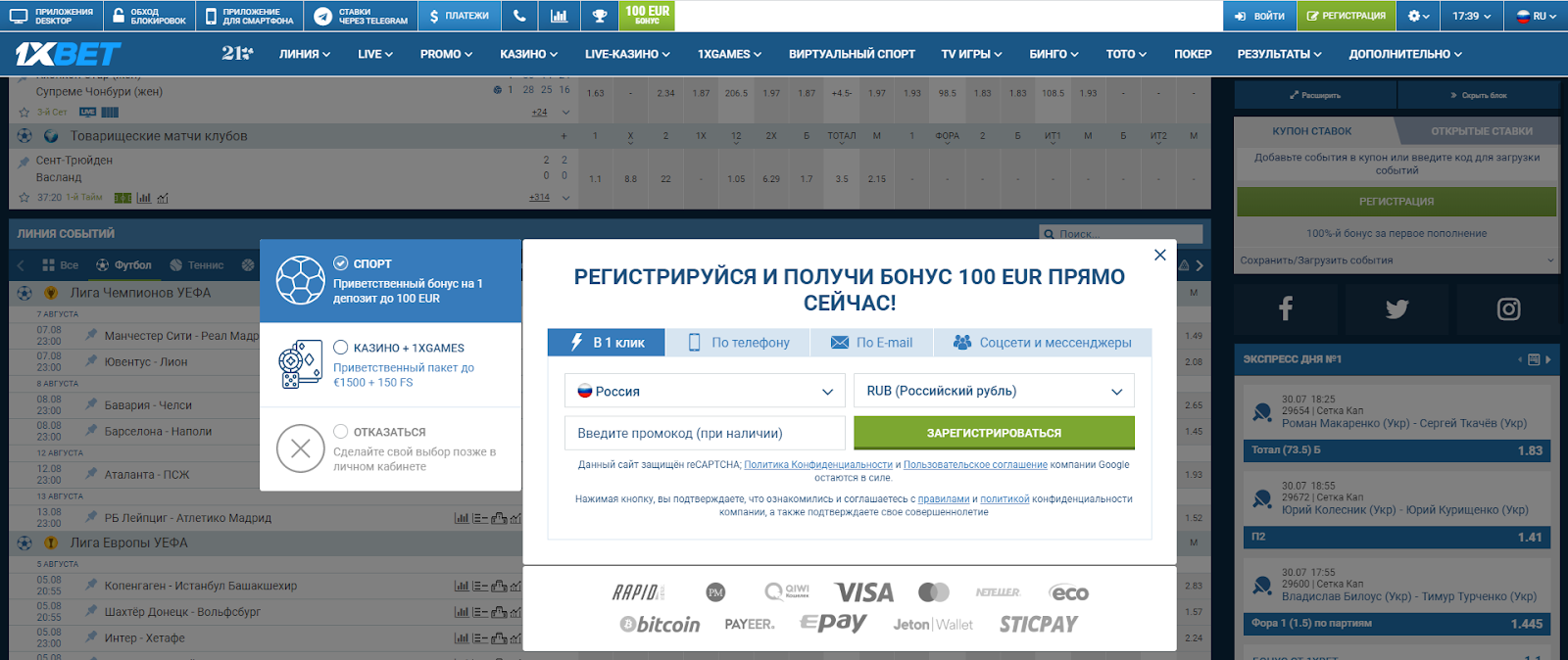 Интересная опция — регистрация «в 1 клик». Нужно указать только свою страну и валюту для игры на ставках и ввести промокод, если он есть. После этого система сама предложит логин и пароль для авторизации на 1xbet.com.