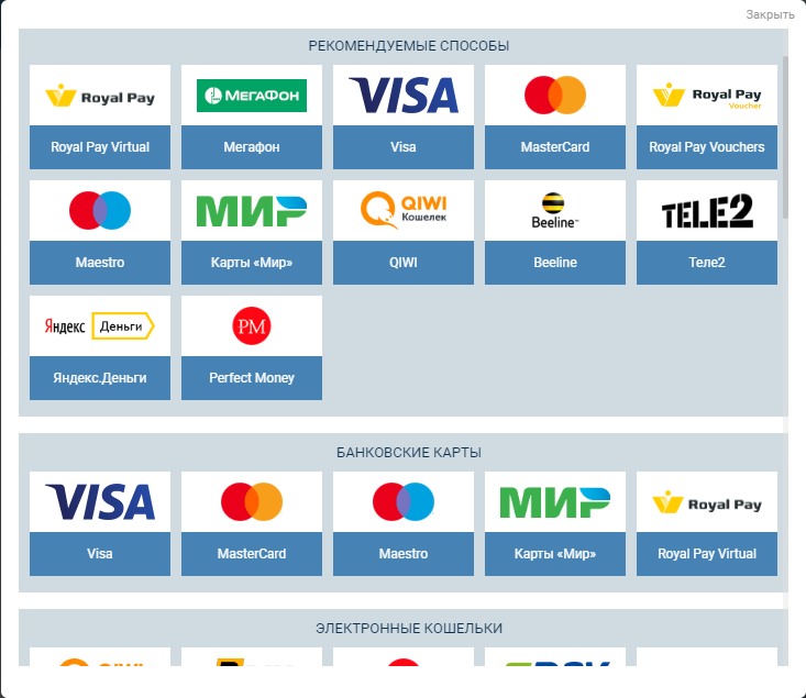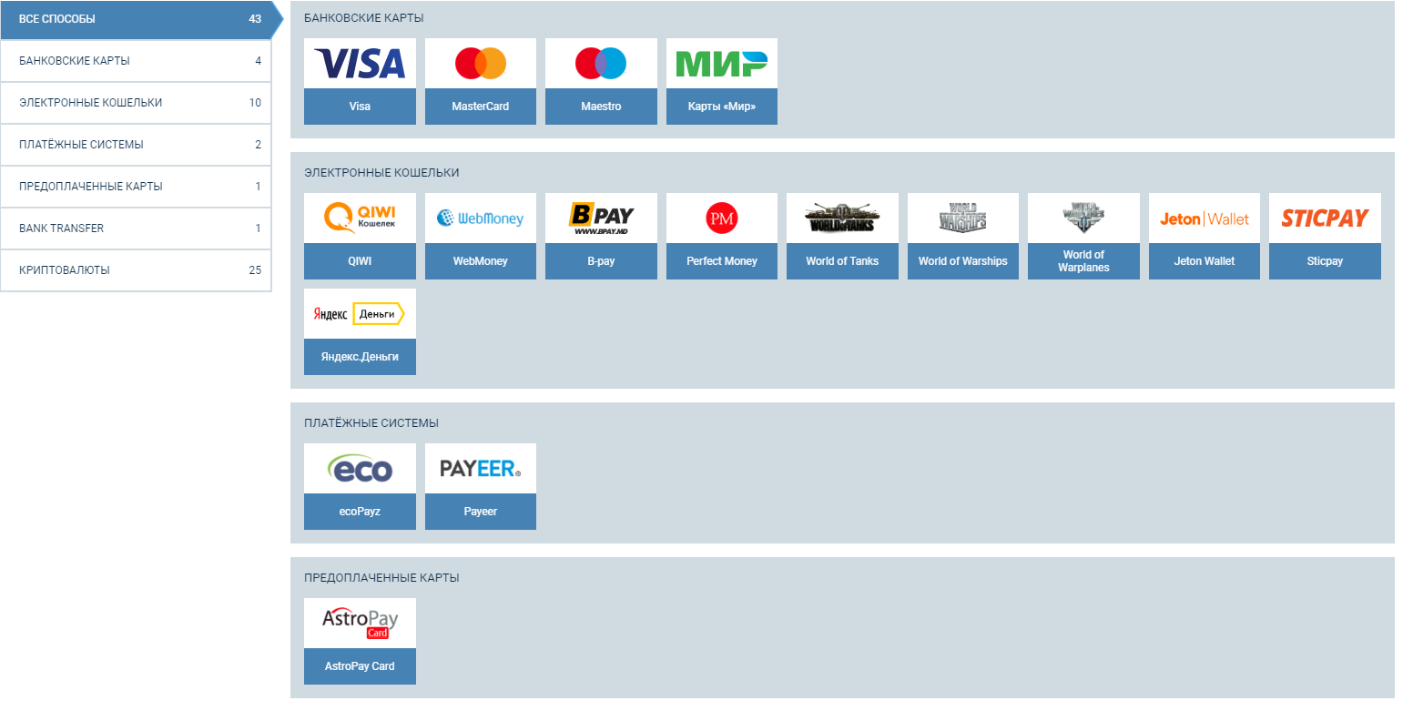 электронные кошельки (Qiwi, WebMoney, B-pay, Perfect Money, World of Tanks, World of Warships, World of Warplanes, Jeton Wallet, Sticpay, Яндекс.Деньги);