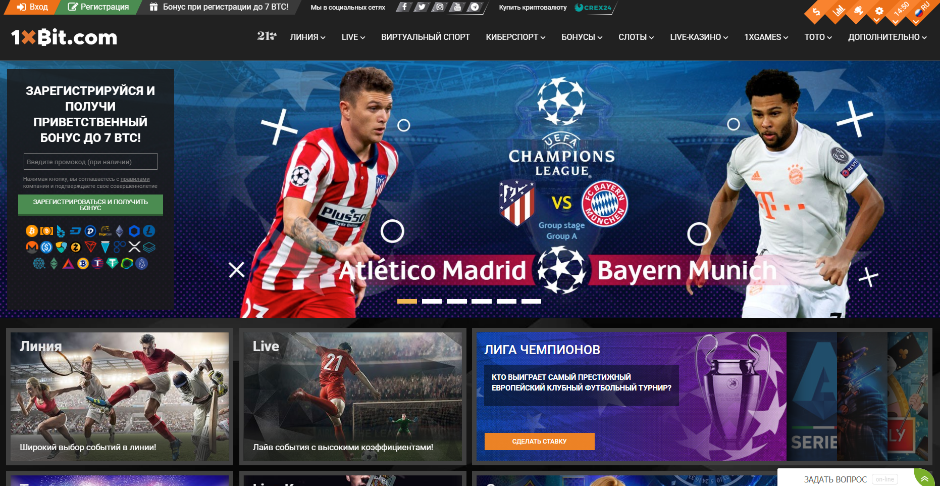 Официальный сайт конторы расположен по адресу: 1xbit.com. На главной странице игрок может делать ставки на спорт, спортивные симуляторы, играть в live-казино, карточные игры, принимать участие в тотализаторах, лотереях.