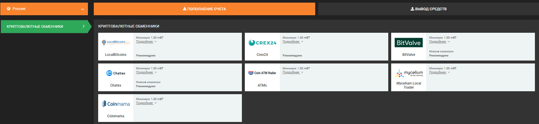 Букмекерская контора 1xBit проводит все финансовые операции по счетам в криптовалюте. Компания предлагает российским игрокам 7 вариантов для пополнения баланса или вывода средств: