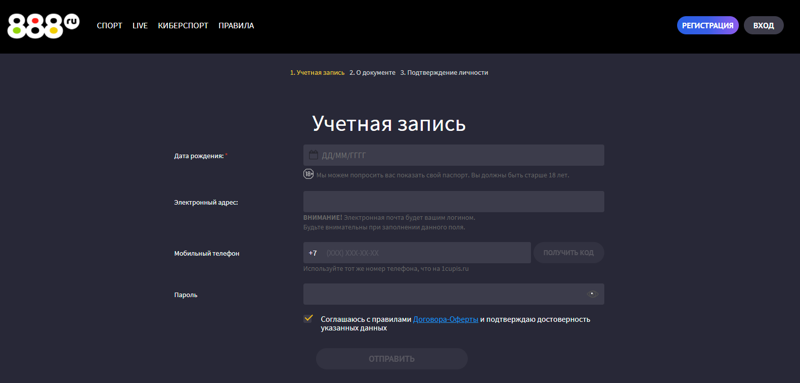 Для регистрации в БК 888.ru необходимо заполнить анкету: