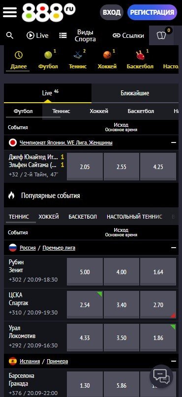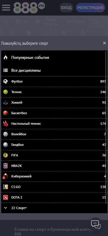 Мобильная версия 888.ru расположена по тому же адресу, что и основной сайт. На платформе можно проводить финансовые операции, делать ставки на спортивные события, следить за результатами матчей и смотреть видеотрансляцию по настольному теннису и киберспорту. В целом мобильный сайт практически не отличается от десктоп-версии.
