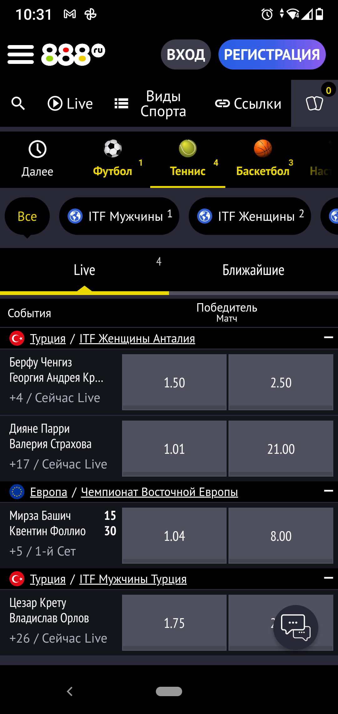 Для европейских лиг высокого уровня предлагается линия с маржей 6-6,5% на основные исходы и 4-5 % на форы и тоталы.Теннис