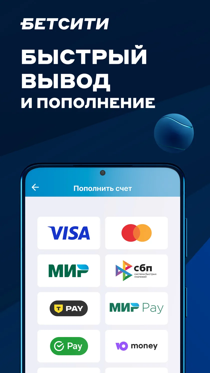 Чтобы пополнить счёт, надо залезть в меню и тапнуть на кнопку «Пополнить». Сделать депозит в БК Betcity можно через банковские карты, интернет-банкинг, счёт мобильного телефона, электронный кошелёк и наличкой через терминалы «Элекснет».