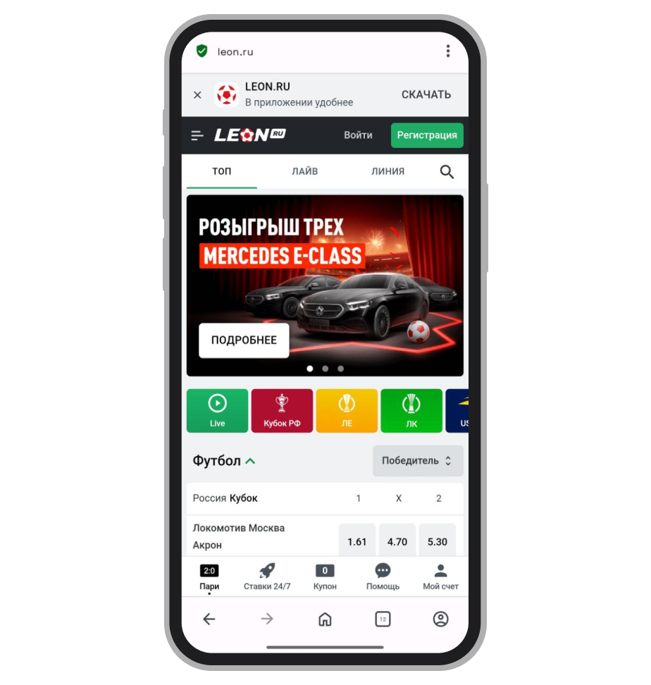 Ставки с телефона или планшета можно делать и на мобильной версии сайта БК «Леон». Сайт автоматически распознает операционную систему устройства и предлагает скачать мобильное приложение. Приложение, как и мобильная версия сайта, сохраняет весь основной функционал. Оно доступно как на iOS, так и на Android. На стартовой странице размещена информация по ставкам Live.