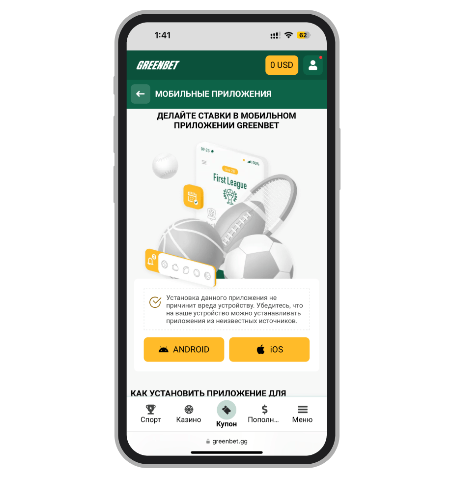 На октябрь 2025 года у Greenbet есть мобильное приложение для Android, которое можно скачать на сайте. Для устройств с iOS доступна мобильная версия сайта, которая работает стабильно и без сбоев.