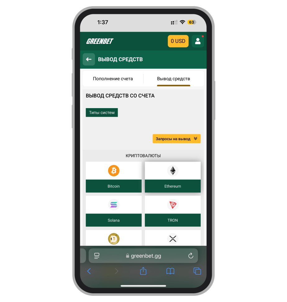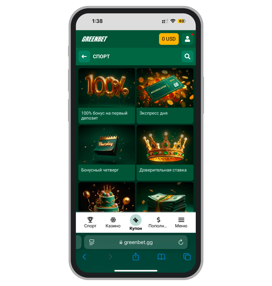 Валюта счёта в Greenbet зависит от региона пользователя. При регистрации потребуется выбрать валюту, которая будет отображаться в личном кабинете, например, USD, EUR, KZT и другие. Методы пополнения зависят от региона.