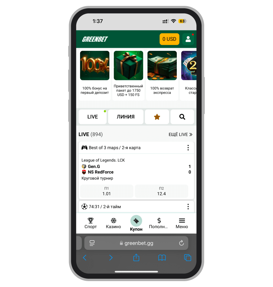 На октябрь 2025 года у Greenbet есть мобильное приложение для Android, которое можно скачать на сайте. Для устройств с iOS доступна мобильная версия сайта, которая работает стабильно и без сбоев.