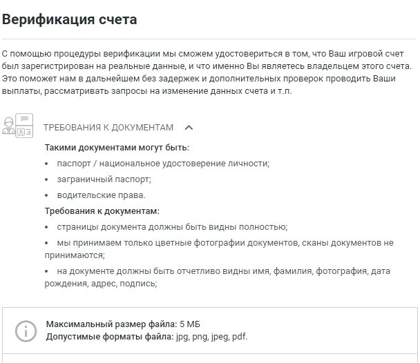 Верификация счета предполагает отправку букмекеру персональных данных: цветную фотографию документа в формате jpg или png размером не более 5 МБ. Можно прислать паспорт, заграничный паспорт или водительские права. На сайте указано, что принимаются только фото, а не сканы.