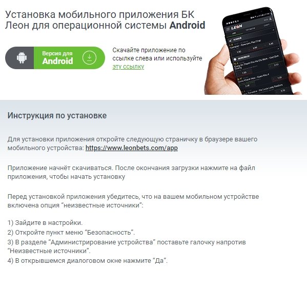 Сделать ставки через мобильное приложение «Леонбетс» смогут только владельцы гаджетов с ОС Андроид. В правом нижнем углу сайта имеются кнопки Android и «Мобильное приложение». Кликнув на любую из них, вы попадёте на страницу с прямой ссылкой для скачивания и пошаговой инструкцией, как установить программу на смартфон или планшет.