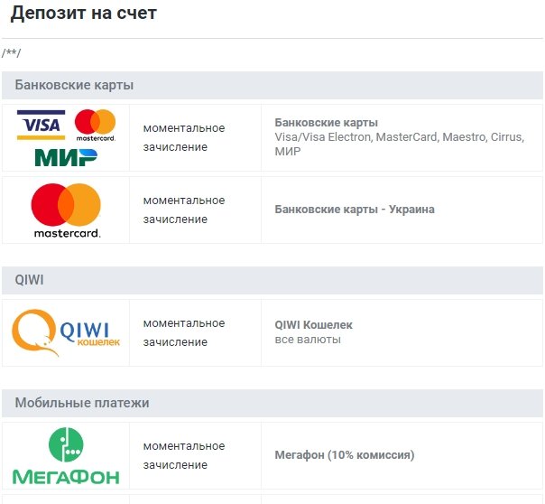 Минимальный депозит - 100 рублей. Самые крупные лимиты при зачислении через банковские карты (до 250 000 рублей) и интернет-платежи (до 300 000 рублей).