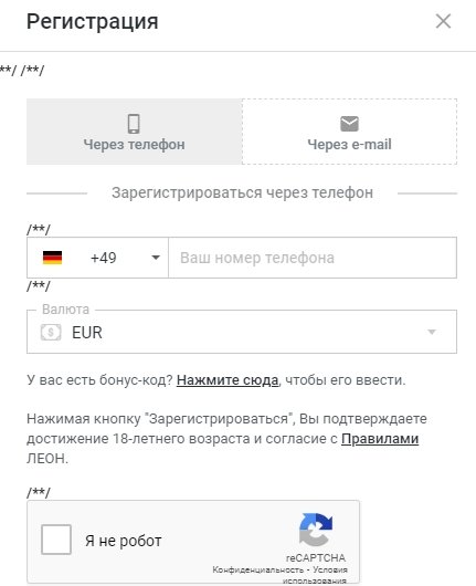Создать учетную запись на сайте БК «Леонбетс» можно двумя способами: через телефон или через e-mail. Оба варианта интуитивно понятны. Пользователю предлагают выбрать валюту счёта из пяти предложенных: российский рубль, доллар США, евро, украинская гривна и казахстанский тенге. Система предоставит пароль и попросит подтвердить страну проживания из выпадающего списка.