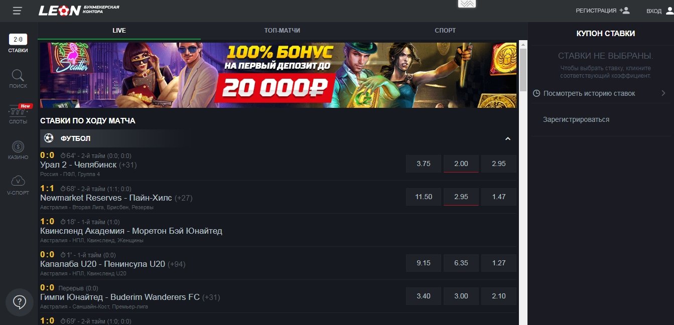 По количеству событий, включаемых в Prematch линию, БК Leon – это качественный продукт с подборкой наиболее востребованных видов спорта. В линии есть виды спорта для игроков, желающих делать ставки на small рынках – бадминтон, сквош, регби, дартс, пляжный футбол, флорбол, смешанные боевые искусства. Наиболее полная линия для ставок на хоккей и баскетбол – с хорошей глубиной и охватом чемпионатов. Глубина чемпионатов в футболе – в основном до второго национального уровня. Региональные или молодежные соревнования в футболе не представлены или представлены слабо. Также стоит отметить практически полное отсутствие в линии теннисных матчей уровня ITF, турниров серии Челленджер. Роспись Prematch - не сильная сторона БК Leon. При этом нет выраженного стандарта по росписи для матча в зависимости от чемпионата. Как правило, для большинства матчей дается лишь ограниченное количество наиболее популярных ставок. Покупка по тоталу и форе не плавная, а с крупным шагом и с недостаточно большим выбором вариантов.