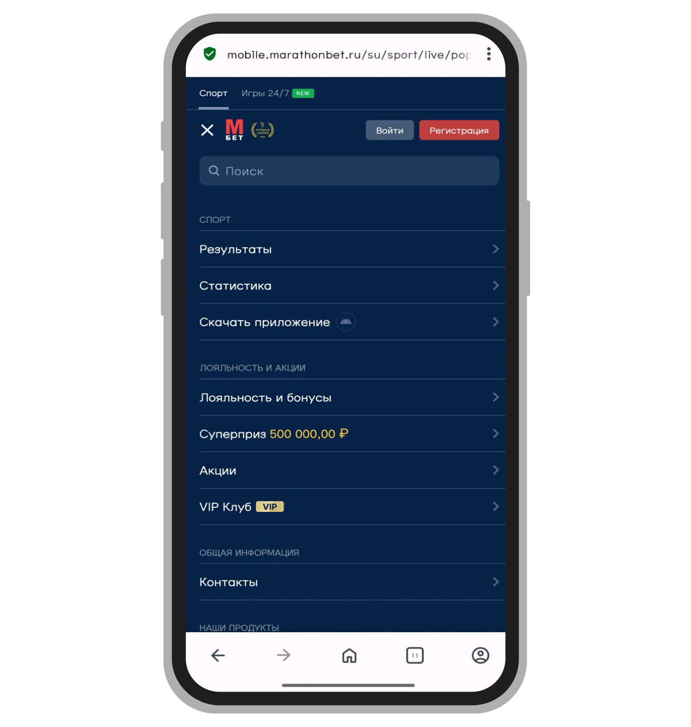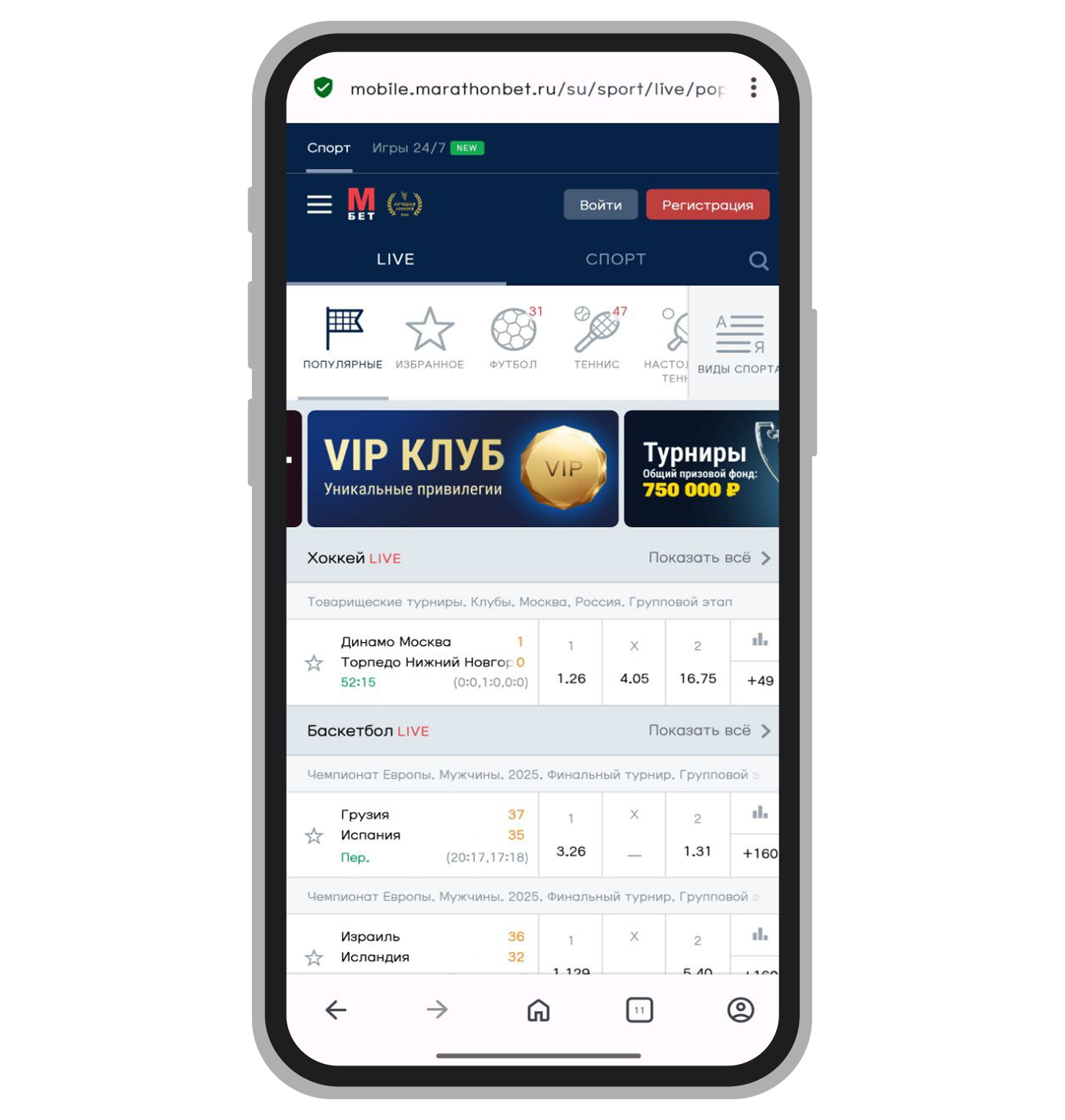 ❗️Преимуществами БК «Марафон» — высокими коэффициентами и широкой росписью — можно воспользоваться и с мобильного телефона. Загружать приложения для iOS или Android необязательно, у сайта marathonbet.ru есть вариант для смартфонов. В обзоре мобильной версии букмекера «Марафон» мы разобрали все ее плюсы и минусы и выяснили, насколько удобно искать события, делать интерактивные ставки и следить за ходом важной игры.