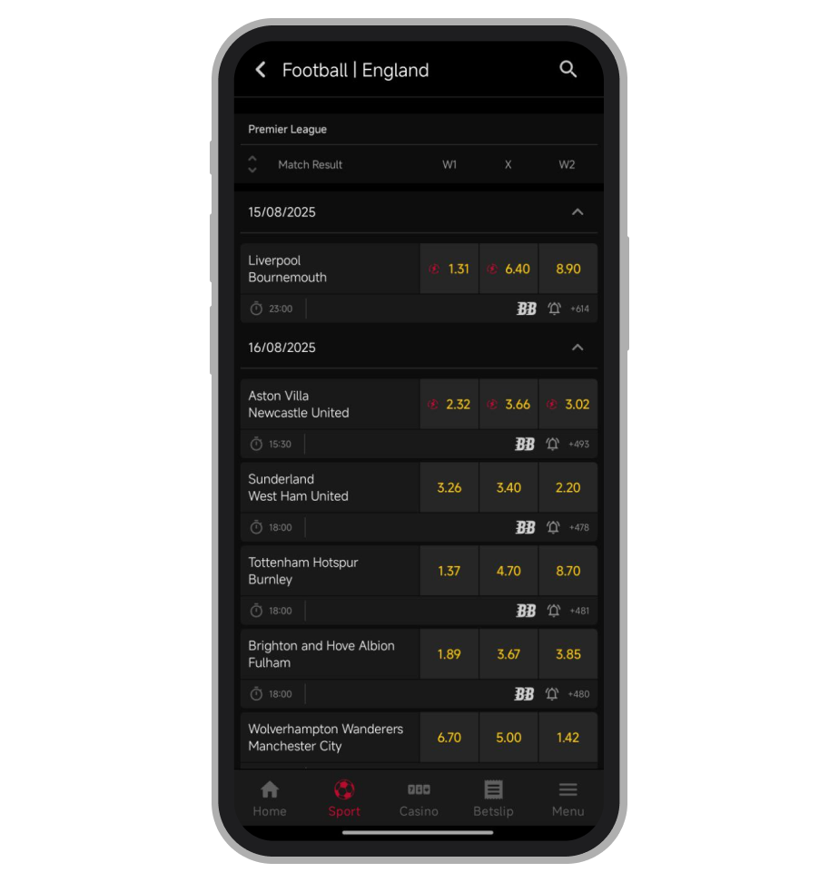 В Mobet ограниченный выбор даже на популярные виды спорта. Например, в английской Премьер-лиге предлагается около 500 маркетов на матч. В линии есть исходы, тоталы, ставки на статистику и авторов голов. По ряду турниров доступны аутрайты.