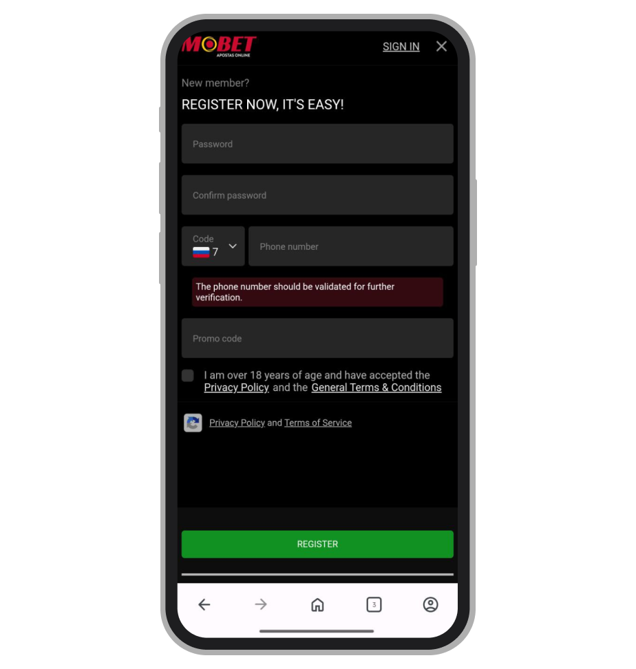 Mobet предлагает пройти регистрацию как на сайте, так и в приложении. Для этого потребуется указать: