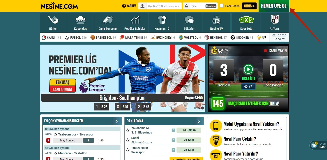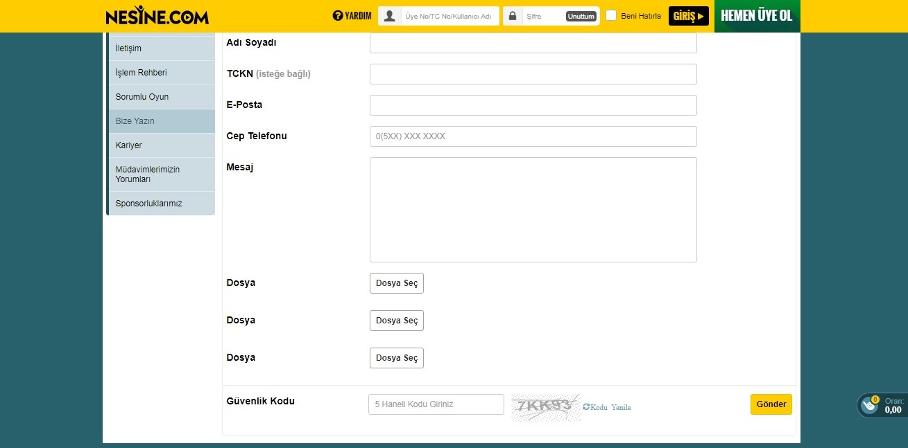 Кнопка регистрации размещена в правом верхнем углу сайта. Стать клиентом букмекерской конторы могут только граждане Турции, так как один из обязательных пунктов формы – налоговый номер (ИНН). Если пользователь не знает его, то система направляет его в базу Министерства внутренних дел. В дальнейшем налоговый номер можно использовать в качестве логина к аккаунту.