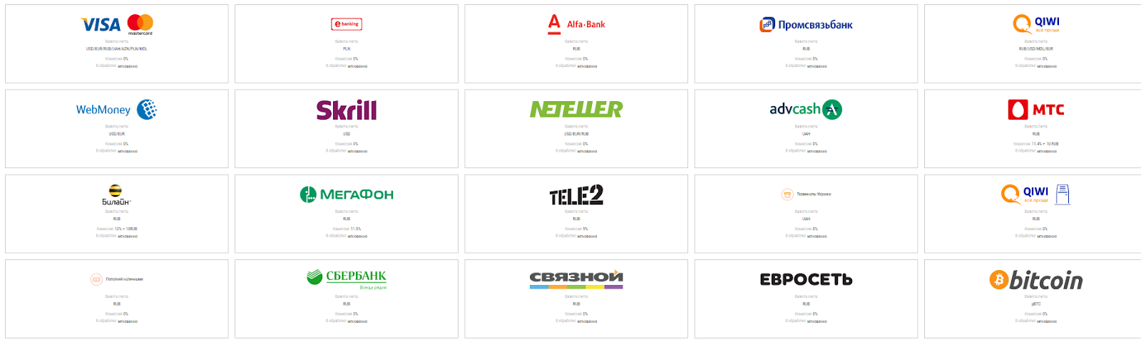 Минимальная сумма депозита — 1 рубль. Деньги поступают на баланс в течение нескольких минут.