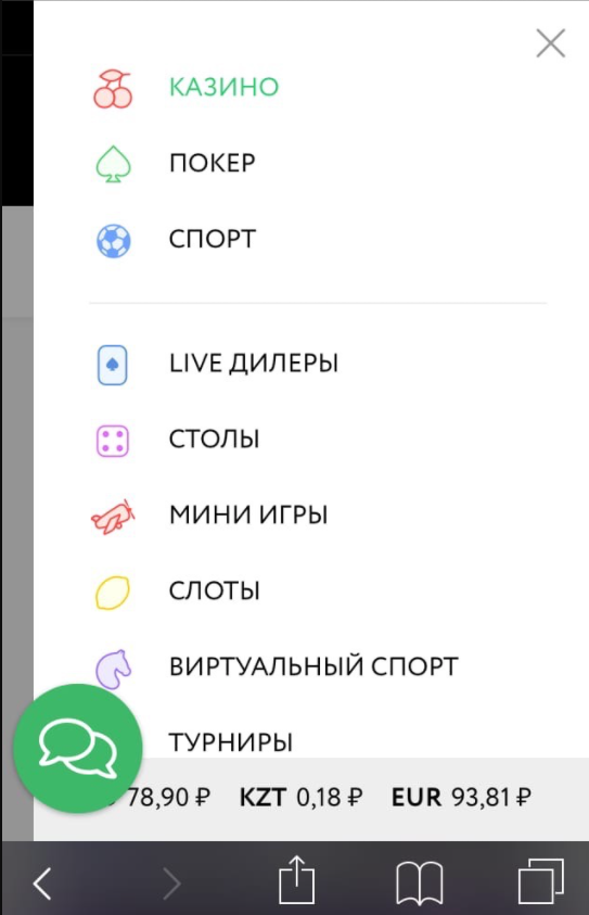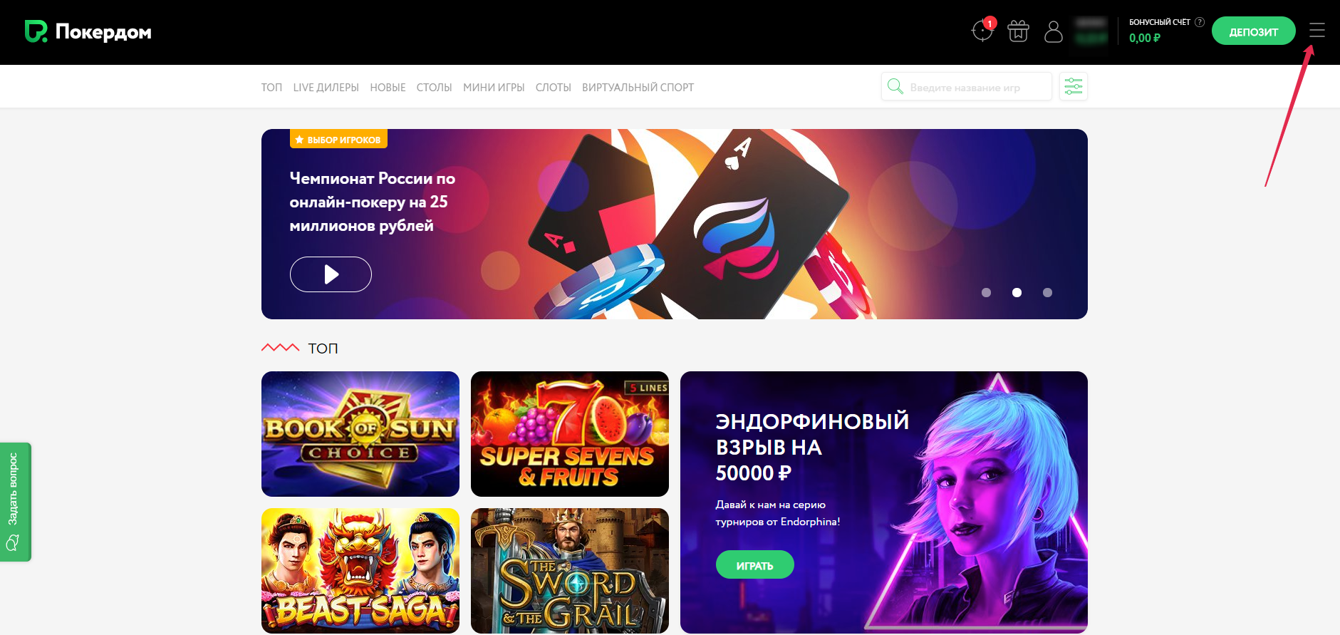 На главной странице представлены разделы игорного онлайн-заведения: покерные столы, казино, слоты, мини-игры, виртуальный спорт. Раздел со ставками на спортивные события расположен в меню пользователя в правом верхнем углу.